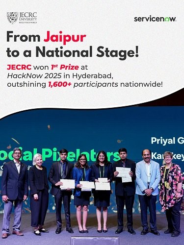 Breaking through a pool of over 1,600 top talents across India, JECRC’s dynamic team “Social Pixelators” has clinched the First Prize at the prestigious ServiceNow University HackNow – India 2025, organized under the ServiceNow AI Skills Summit with support from Deloitte.