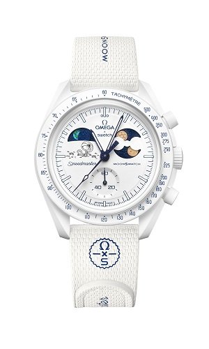 Dial: white opaline with OMEGA X Swatch, Speedmaster and MoonSwatch logos; recessed subdial, hour markers coated with Grade A Super-LumiNova (green emission).