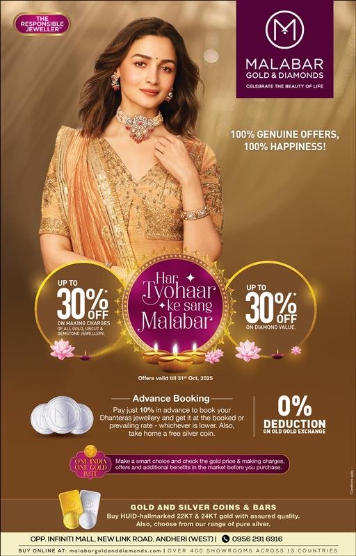 Speaking about the festive offers, M.P. Ahammad, Chairman, Malabar Group, said, ‘’As a jeweller deeply committed to customer delight, we are delighted to unveil our exclusive Diwali 2025 celebrations with 100% Genuine Offers, 100% Happiness. With benefits such as rate protection scheme, and transparent pricing, we aim to make this festive season truly memorable. Our continued global growth and leadership stand as a testament to the trust and loyalty our valued customers place in us year after year.’’