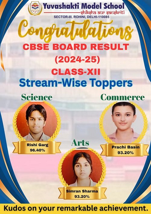 First position holder of Class 12 from Yuvashakti Model School, Rohini, marks a proud academic achievement in the CBSE 2025 Board Exams